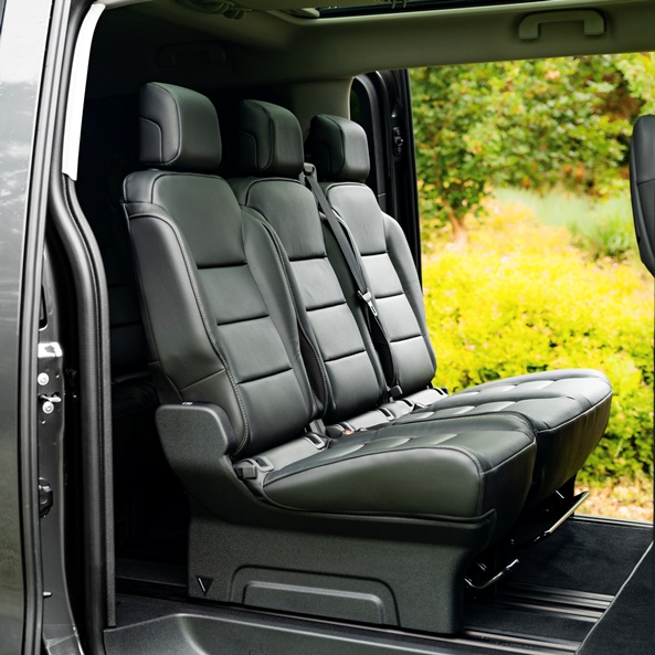 Počet sedadel může být až devět a je nespočet způsobů, jak je uspořádat. Dají se posouvat, sklápět i úplně vyjmout. Posuvné boční dveře se ovládají elektricky, a navíc mají hands-free přístup umožňující jejich bezdoykové otevření. Rodiny s více dětmi ocení fakt, že i v bezpečnostních sedačkách pohodlně usadíte tři děti vedle sebe!