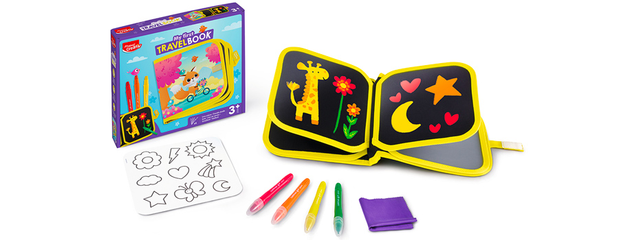 Praktická kreativní sada Maped Creativ Early Age My First Travel Book je skvělá pro malé děti doma i na cestách. Obsahuje přenosný kreslicí sešit s černými mazatelnými stránkami, na které děti kreslí gelovými pastelkami. Hotové obrázky lze jednoduše setřít hadříkem a zábava může začít znovu.