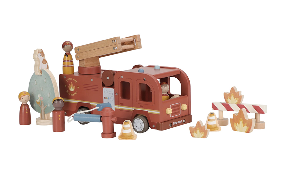 Hasičský náklaďák se čtyřmi hasiči je připraven vyrazit do akce! Někdy je potřeba zachránit kočičku ze stronu, jindy uhasit požár nebo pomoci policii při dopravní nehodě. Pro všechny tyto situace je náklaďák vybaven výsuvným žebříkem a odnímatelnou hadicí, kterou lze připojit k hydrantu nebo přímo k vozu. Sadu tvoří hasičský náklaďák, čtyři figurky hasičů, plameny, hydrant, strom s kočičkou a zábrana – vše, co je potřebné pro napínavou záchrannou misi. Robustní provedení, pohyblivé části a důraz na detail podporují rozvoj motoriky, fantazie a schopnosti vyprávět příběhy. Hračka je součástí kolekce vysoce kvalitních dřevěných hraček Little Dutch, navržených s důrazem na bezpečnost a originální design. Vyrobeno z odolného FSC certifikovaného dřeva. Vhodné pro děti od 2 let.