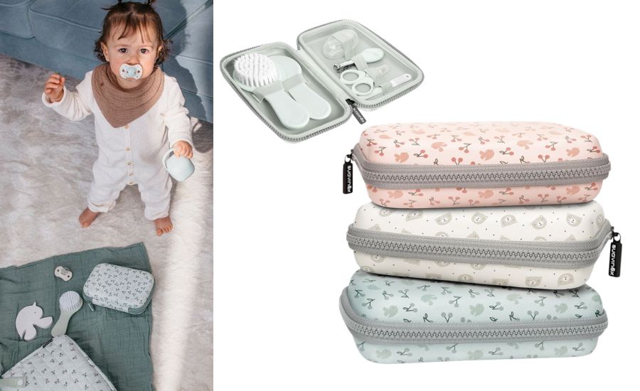 Miluji značku Suavinex a její designy. Nabízí nádherné dudlíky a držáky na dudlíky, lahvičky, brýle, kosmetiku a novinkou je právě i tato super sada, která obsahuje vše, co budete potřebovat k péči o novorozence. Zároveň je celá zabalená v praktickém a krásném pouzdru. Sada obsahuje zubní kartáček, který si nasadíte na prst a vyčistíte tak první zoubky, kartáč, hřeben, nůžky, kleštičky a pilníček na nehty. Navíc je super praktická i na cesty. Podobnou jsem měla, když byla dcera miminko, a dodnes používáme kartáč i hřeben, i když už jen na panenky.